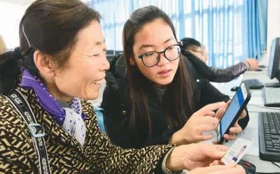江蘇省鎮江市潤州區七里甸社區聯合江蘇科技大學成立老年網校,幫助老人們快樂上網,豐富文化生活。下圖為志愿者向老年居民傳授智能手機上網購票技能。